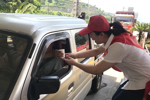 圖為志愿者為過往司機遞上消暑品 “師傅,辛苦啦!喝杯綠豆湯,解解暑氣吧!” “大熱天的,您可要多注意休息呀,千萬別疲勞駕駛,這是礦泉水和風油精,希望能幫您緩解疲勞?!?/span> 活動當天,該所在車道安全島內搭起臨時“便民服務臺”,為司乘人員免費提供礦泉水、綠豆湯等解暑佳品。同時還針對夏季出行容易出現的中暑、暈車現象,備足風油精、人丹等解暑降溫藥品。