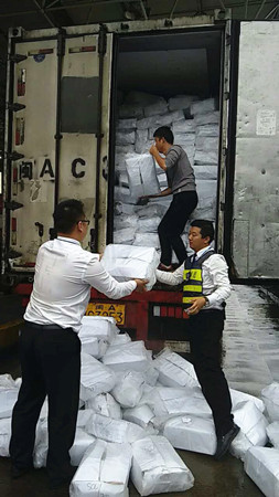 圖為工作人員幫忙搬運掉落的貨物 這輛滿載海鮮的綠農車,貨物掉滿車道,司機一人束手無策,當班班長陳豐平在拍完綠農照片后,叫上班員林葉輝,一起快速幫助司機一件一件地傳遞貨物。盡管每一袋貨物都十分重,但是他們為了幫助師傅提早整理貨物,顧不得臉上交織的汗水和雨水。 由于工作人員的幫助,司機離開時一直道謝。他們對司乘人員的主動援助,使得溫嶺西收費所的服務不單單停留在窗口問候上,還將延伸服務一直呈現。 陳豐平