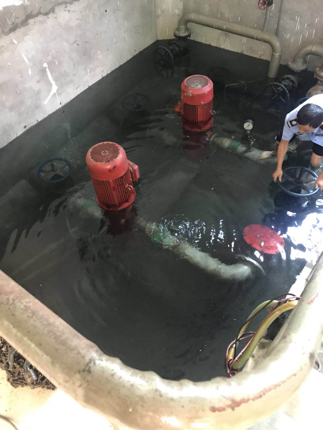 圖為執勤隊員在關閉閥門 “看,應該是這里漏水了,有水暈在動?!?/span> “對,就是這里了。” “水馬上要沒到電機了,趕快關閉閥門,不然損失就大了?!?/span> 此時,陳旦平沒有多想,立即下水去關閉水泵閥門。池中有2號泵的高位水池閥門和2號泵的集水池閥門,每個泵各有兩個閥門。陳旦平在迅速關閉閥門后,由于集水池這邊地勢較低,慌忙中的他忘拿手機,手機被水浸到,他卻依舊埋頭于搶修。 據隊長李新波說,此次“水災”是北泵房2號泵的壓力表處水管漏水,原因是設備設施使用時間較長,水管陳舊銹蝕,抵不住水壓,導致水管開裂,引起漏水。 胡瑰華