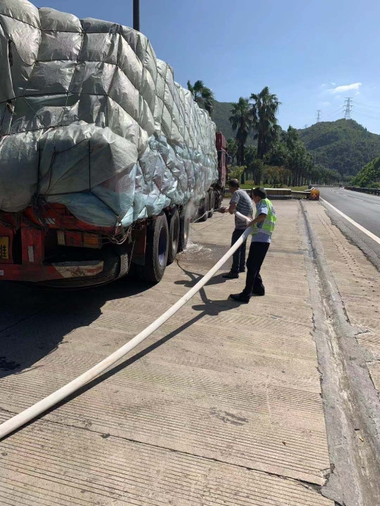 圖為消滅隱患現(xiàn)場 同時(shí),中控員密切關(guān)注車輛動(dòng)向,13:37,中控員在隧道南廣場發(fā)現(xiàn)該車,巡邏車立即奔赴現(xiàn)場,該車后輪胎剎車位置在冒煙,司機(jī)正用礦泉水澆輪胎,隊(duì)員們見狀,火速上前把消防栓打開,接上消防水帶,交與該車司機(jī),托著消防水帶,對準(zhǔn)輪胎接連猛射,冷卻剎車片,輪胎終于沒有冒煙,一場隱患被隊(duì)員消除了。 據(jù)悉,該輛半掛車因輪胎爆炸,引起冒煙,司機(jī)卻想著從下一個(gè)高速出口,幸好隊(duì)員們監(jiān)控及時(shí),出警迅速,施救到位,把隱患扼殺在搖籃里,沒在隧道內(nèi)發(fā)生火災(zāi),不然后果將無法想象。 現(xiàn)場,隊(duì)長告知司機(jī),萬一車輛發(fā)生火災(zāi),請把車停在隧道外,若在隧道內(nèi)發(fā)現(xiàn)車輛起火,請加速駛往隧道口,盡快駛離隧道,避免造成人員傷亡。 陳智慧