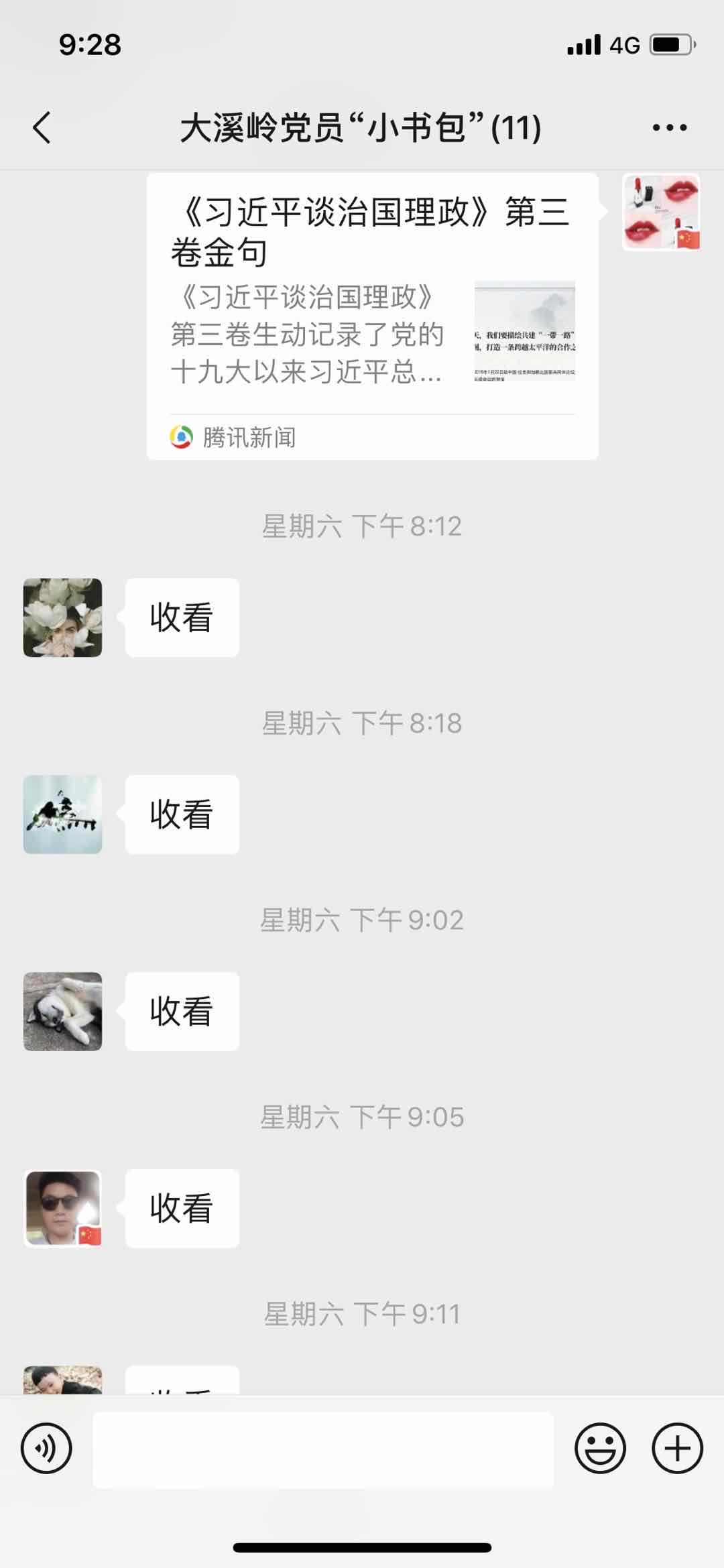 黨員“小書包”的建立,進一步拓展和暢通了聯(lián)系黨員的信息渠道,可以24小時在線聯(lián)系黨員、征求意見,能在線進行實時回復(fù)和互動,同時可以通過微信群及時發(fā)布上級文件精神、習(xí)近平總書記重要講話內(nèi)容、學(xué)習(xí)教育心得、會議通知等等,進一步提高學(xué)習(xí)教育效能。 黨員“小書包”的建立,讓黨員們的學(xué)習(xí)內(nèi)容不受書本限制,學(xué)習(xí)教育不受地域、場所的限制,在繁忙的工作學(xué)習(xí)之余,大家可以在微信群中了解當(dāng)前時下最新的學(xué)習(xí)內(nèi)容、信息和動態(tài),相互學(xué)習(xí),交流體會,無形提升自己的政治素養(yǎng)。 黨員“小書包”的建立,實現(xiàn)了黨組織和黨員之間“親密”、“即時”、“微距”的接觸,加強了黨員同黨組織之間的信息互動。通過“小書包”的建設(shè),大溪嶺學(xué)習(xí)教育時刻保持鮮活的生命活力和時代氣息,形成了“輕松自主學(xué)習(xí)、實時互動交流”的良好學(xué)習(xí)氛圍,提供了更好的動力。