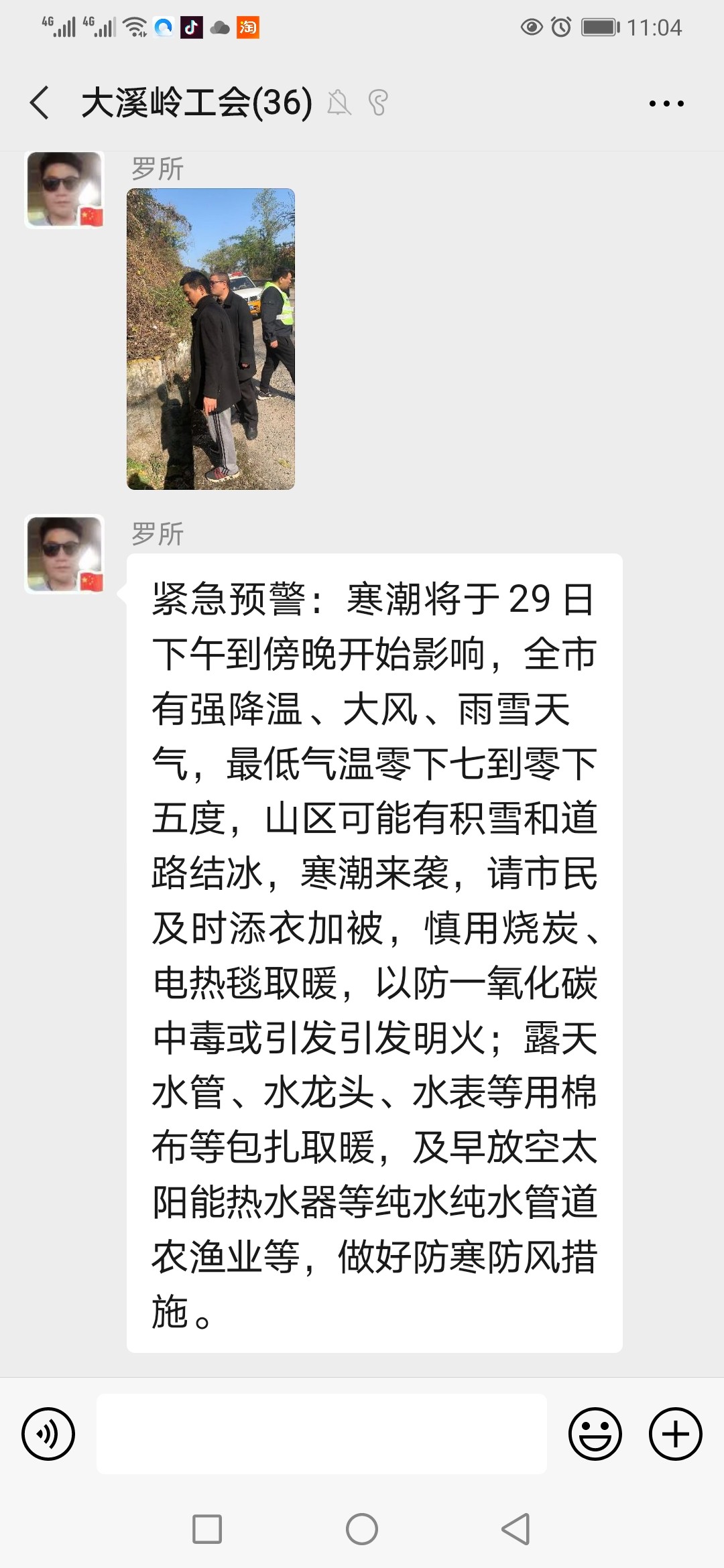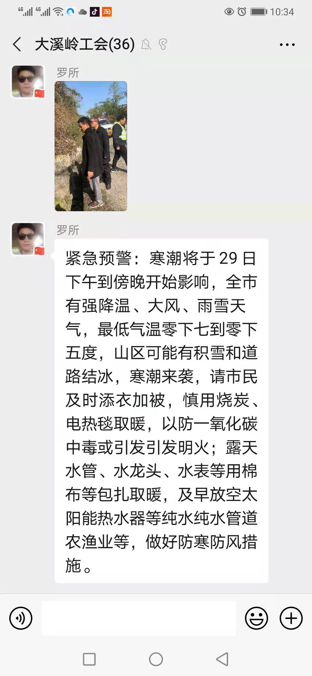 大溪嶺暖心行動還在所里的工作群中“溫馨提醒:寒潮前家中如何做好用水設(shè)備的防凍保暖”,并提醒安全用電注意事項。2020的最后幾天,希望大家都能平平安安地度過,迎接牛氣沖天的2021! 陳智慧