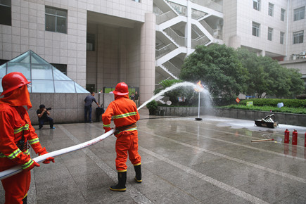 會后,在項同富的總指揮下,所有人員冒雨到現(xiàn)場觀摩高層逃生演練和消防應(yīng)急拉動滅火模擬演練。隨著一聲“演練開始”指令,大樓16層窗口冒出滾滾濃煙,被困人員使用緩降器順利降至5樓室外平臺。面對大樓南側(cè)的“火災(zāi)”,兩組身穿專業(yè)消防服的參演人員迅速到位,一組拿水槍,一組提起滅火器,迅速撲滅火源。演練圓滿結(jié)束。消防專業(yè)人員在現(xiàn)場為大家點評演練,指出逃生、滅火過程中的細(xì)節(jié)問題和注意事項,并提醒大家面對火災(zāi),要先控火再抗火,掌握科學(xué)的滅火方法。