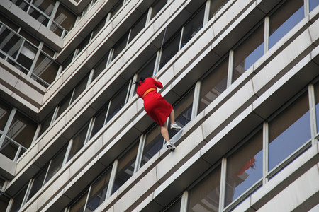 圖為演練前集團安全總監項同富介紹高層緩降逃生設備 培訓結束后,參會人員集體到集團大樓5樓外平臺觀摩高層緩降逃生演練。在演練中,2名模擬被困人員先后使用高層緩降逃生設備從16樓窗口平安緩降逃生到5樓平臺。之后通過演練和講評,大家進一步熟悉了高層緩降逃生設備及使用方法,拓展了高層建筑逃生思路。 陳科