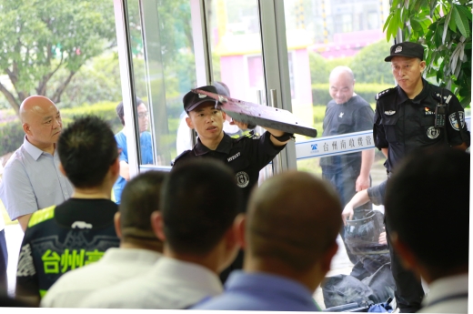 圖為安全總監項同富總結演練現場 本次活動分成防暴器械使用培訓、器械使用練習和防盜搶應急演練三個環節,以培訓和演練相結合的形式開展,以有效提高一線職工防暴器械使用技能和突發事件應急處置能力。活動邀請了黃巖公安分局巡特警大隊大隊長盧健星,該大隊獵豹突擊隊隊員、專職教官盧尚明到場指導。