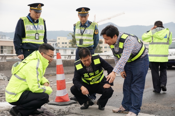 集團聯合高速交警、路政檢查第一階段斷流施工情況 11月7日上午,集團聯合高速交警、高速路政等單位實地踏勘了集團沿線斷流施工現場,檢查第一階段施工進展情況及現場交通管控點、收費站分流點交通流等情況,集團總工程師江輝、高速交警臺州支隊副支隊長沈汝寬、高速路政領導參加檢查。